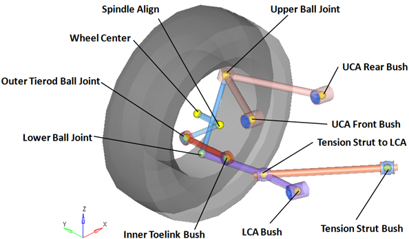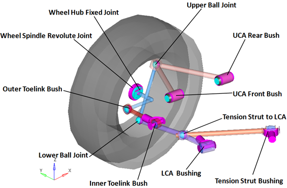 | LCA Bushing | ブッシュ | ロアコントロールアーム | サブフレーム、車体、または地面 | LCAリアブッシュ | CompliantオプションがNoに設定されると、このジョイントのコンプライアンスは“オフ”に設定され、純粋なユニバーサルジョイントとして動作します。 |