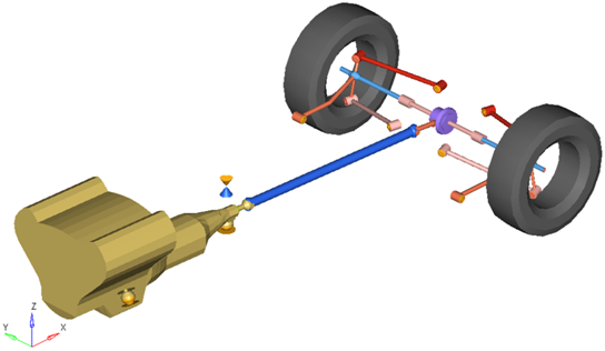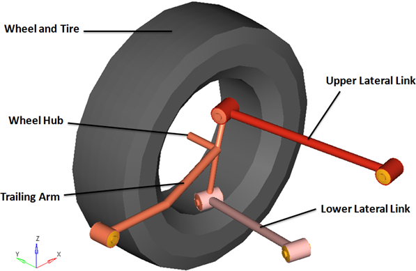 rear trailing armサスペンションシステムは、車両半分の解析またはフルビークルの解析のどちらでも使用できます。デフォルトの形状および質量は乗用車または小型トラックと同じですが、モデルおよびデータは、大型トラックから縮尺モデルの車まで、任意のサイズの車両を反映するように修正できます。