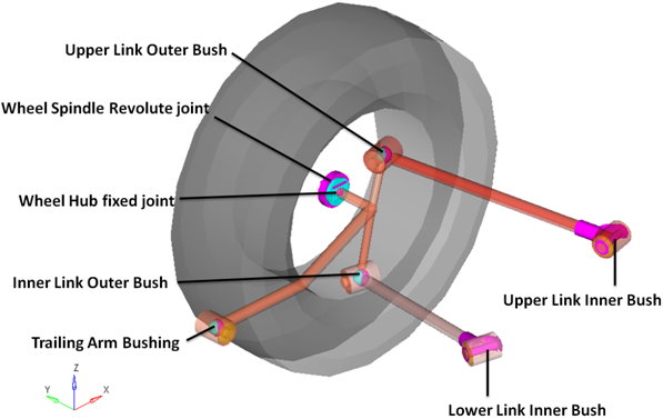 rear trailing armサスペンションはリア独立懸架システムで、ブッシュを軸として回転するアームの終端にホイールが結合されています(これによりホイールの上下運動が可能になります)。サスペンション設計では、トレーリングアームは柔軟でなければ機能しません。トレーリングアームのボディをシミュレーションするときは、通常、弾性体が使用されます。
