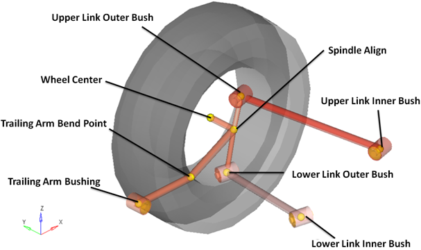 ポイントによって、サスペンション内のジョイントとブッシュの位置を定めます。以下の図に、rear trailing armサスペンションの主要ポイントを示します。 図 4. 右側の主要ポイント – リアトレーリングアーム式サスペンション