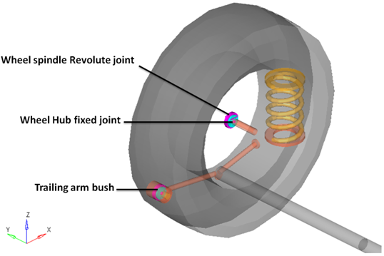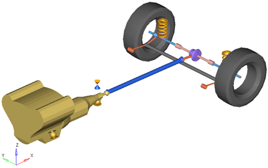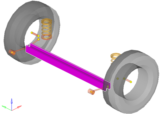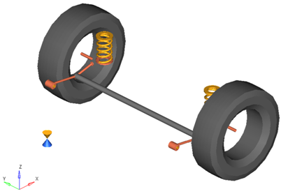 - モデルには、車軸のねじり部分を表すビームが含まれています。これは、車両プログラムの初期段階における車軸を適切に表しています。設計が改良されると、軸のねじりを弾性体で表す必要があります。