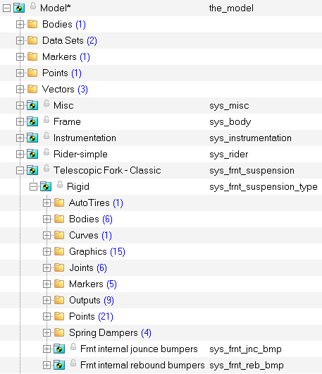 以下の図は、すべてのデータが読み込まれたフロントサスペンションモデルに関するシステムを表示したブラウザです。