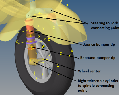 ポイントによって、サスペンションのボディを互いに結合するジョイントとブッシュの位置を定めます。以下の図は、フロントテレスコピックフォークサスペンションの主要ポイントを示しています。図 3. フロントテレスコピックフォーク(従来型)サスペンション右側の各ポイント