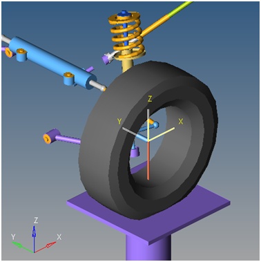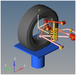 車両前部の静的ライド解析では、JackおよびDummy bodyの2つのボディが使用されています。Jackは、垂直に動いてサスペンションの変位を発生するプラットフォームをシミュレートするために使用します。Dummy bodyは、システムにADAMSモデリングとの互換性を実現できるように解析に用意されています。Dummy bodyは固定ジョイントでナックルに結合されているので、MotionSolveで実行する場合は解析での役割はありません。