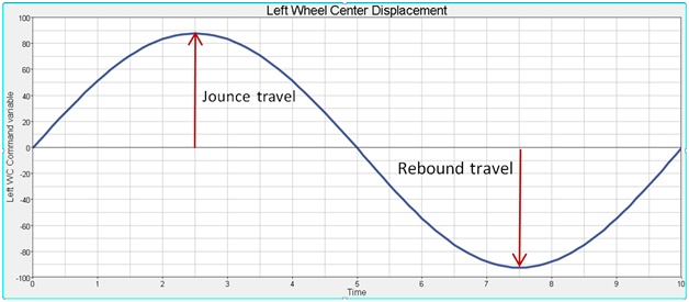 - 左ホイール中心に要求した変位。0~5秒の間は、static ride parametersフォームで定義したジャウンスストロークに等しい大きさを持つ半波正弦関数。5~10秒の間は、static ride parametersフォームで定義したリバウンドストロークに等しい大きさを持つ半波正弦関数。