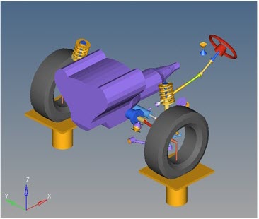 静的ライド解析は、車両の前半分および後ろ半分についてMotionViewのAssembly Wizardで構築したモデルで動作するように設計されています。この解析は、Task Wizardを使用して追加すると自動的にモデルに付加されます。解析のアタッチメント方式が厳密に順守されていれば、手動で構築したモデルで解析を使用できます。 図 1. フロントサスペンションの静的ライド解析