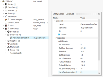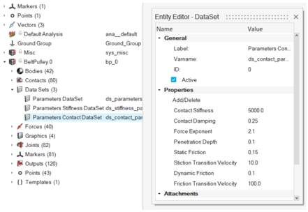 離散化剛体または部分構造の弾性体からなるベルトの場合、ベルトとプーリー間の接触のパラメータは、それぞれデータセットParameters Contact DataSetとds_contactを通じて変更できます。図 7.