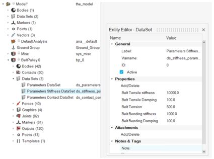 離散化した剛体ボディベルトの場合は、剛性パラメータとベルト張力をデータセットParameters Stiffness DataSetを使用して変更できます。図 6.