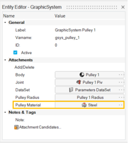 - NLFEベルトと離散化剛体の場合は、プーリーのグラフィックシステムを選択して、エンティティエディターのAttachmentsセクションで材料アタッチメントを変更します: