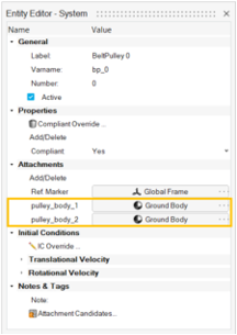 デフォルトで、プーリーは回転ジョイントを経由してグラウンドボディに結合されます。これらのアタッチメントのいずれかを異なるボディに変更するには、モデルブラウザでBeltPulleyシステムを選択して、エンティティエディターのAttachmentsセクションでpulley_body_nというボディアタッチメント次のように変更します:図 1.
