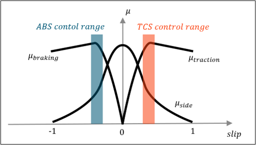 ブレーキ操作中だけでなく、タイヤと路面との接触領域で強い縦方向の力が伝達されるときにも重大な運転状況が発生する可能性があります。その理由は、過剰な縦方向のスリップが誘引されることから、伝達できる横方向の力が減少することにあります。発進と加速のときにも重大な状況の発生が考えられます。特に、滑りやすい路面、傾斜地、コーナリングでその可能性が高くなります。このような状況ではドライバーが誤った反応を示して、車両が不安定になる傾向があります。