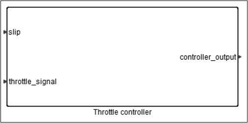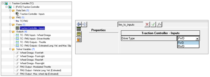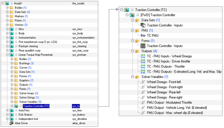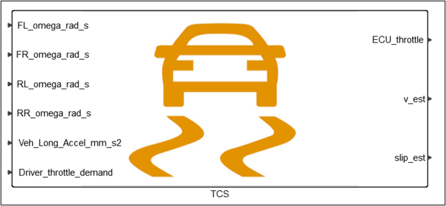 Assembly Wizardを使用して乗用車や小型トラックのモデルを構築するときに、トラクション制御システムの搭載を選択できます。MotionViewシステムのTCでは、ホイールの回転速度、車両の縦加速度、Driverのスロットル要求などの情報をMotionViewモデルから収集し、Functional Mock-up Unit(FMU)としてMotionViewにインポートしたTC Twin Activateモデルへの入力としています。TC Twin Activateモデルは、車輪のスリップを推定して、MotionViewのパワートレインシステムに調整済みスロットルを出力します。パワートレインシステムは、この調整済みスロットルに基づいて、車両を運転するうえで必要な等価トルクを出力します。Traction Controller Twin Activateモデル(.scmファイル)はMDLライブラリ(…\hwdesktop\hw\mdl\mdllib\Common\FMU_Library\TC)に用意されていて、表示と編集ができます。