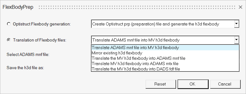 | ADAMS mnfファイルからMV h3d弾性体への変換 | ADAMS MNFファイルをAltair H3D弾性体ファイルに変換します。 必要な情報はADAMS MNFファイルに埋め込まれているため、追加の情報を提供する必要はありません。 |