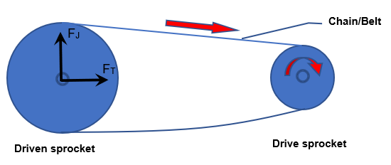 - Fx: 2つのスプロケットを結合するライン方向に作用します。エンジンのトルクによって発生するチェーン張力(FT)です。