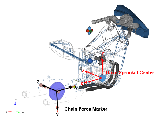 - チェーンフォース要素は、チェーンフォースマーカーを基準として作成されています。このフォースは、後輪とエンジン / 駆動スプロケットの間に作用します。このフォースは次の成分で構成されています: