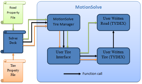 - これが構築されると、User tire interfaceは、シミュレーションの間に何度もユーザー定義のタイヤモデルをコールし、TYDEX形式で記述された情報を渡します。