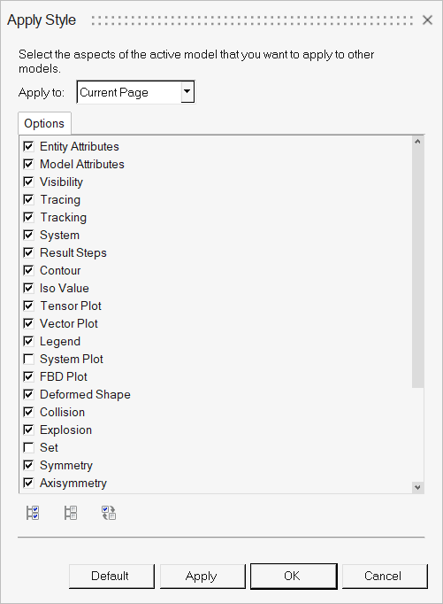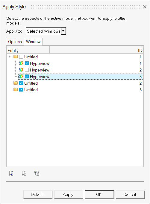 Apply Styleダイアログでは、現在のウィンドウ内のアクティブモデルの表示属性を選択し、現在のウィンドウ、現在のページ、すべてのページ、またはセッション内で選択されたHyperViewウィンドウ上のすべてのモデルに適用することができます。