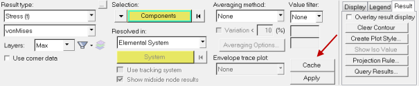 Cache/Delete Cacheボタン(Contourパネルの下部の中央に配置)は、現在のコンター付き結果と一致しない情報がこのパネルに表示されているときは常に無効になります。このボタンを有効にするには、このパネル上の情報と一致するコンター結果を適用する必要があります。