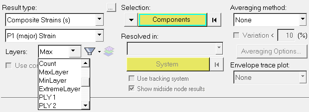 個別のプライに加えて、min/max/extreme/sum/average/rangeのようないくつかの標準の集計モードがあります。これらの集計モードは、複数のプライにまたがって結果を処理し、対応する値をコンタープロットします。Layer Filterを使用すると、選択されたプライ上の結果のみを集計できます。これが役に立つ事例としては、特定の材料や特定の方向のプライのみ(積層材内のすべてのプライではなく)の間から最大値を求める場合が挙げられます。