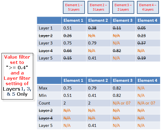 0.4以上(Value filter設定)である層1、3、および5(Layer filterを使用して選択)のみが合計数およびその他の計算(最大値、最小値など)に含まれます。
