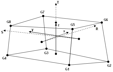 - Hexa(六面体)要素についての要素座標系は、向かい合う面の中心同士を結ぶ3つのベクトルR、S、Tを使って定義されます。
