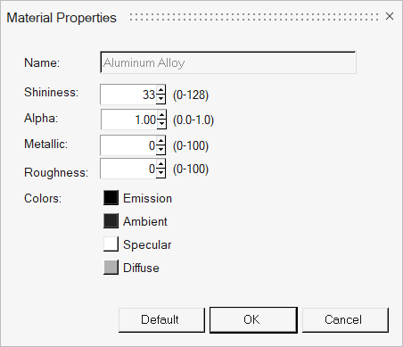 - Material Propertiesダイアログを開きます。このダイアログでは、選択された材料の現在の材料プロパティが表示されます。材料の色と光の特性は、このダイアログで変更することが可能です。