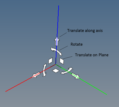 グラフィカルマニピュレータを使用するには、それらをマウスで選択し、ドラッグして操作を実行します。各マニピュレータにはそれぞれ異なる操作が用意されています。例えば、切断面を軸に沿って平行移動させるには、希望する方向を指している矢印を選択し、マウスでドラッグします。