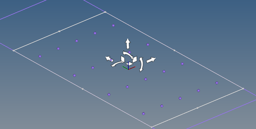 各矢印は、直線に沿って自由にドラッグできます。矩形の領域全体はそれに従って移動し、サイズと形状は同じに留まります。弧状の矢印は、掴んで、矩形領域を面への法線周りに回転させることができます。正方形のハンドルは、領域のプレーン上を自由にドラッグして矩形領域を再配置することが可能です。