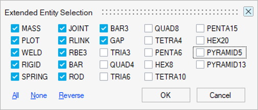 を使用して、まずエンティティの種類 (Assemblies、Components、Elements、Materials、Nodes、Properties、またはSystems) を選択してから、画面からエンティティを選択するか、またはアドバンスト選択を使用します。