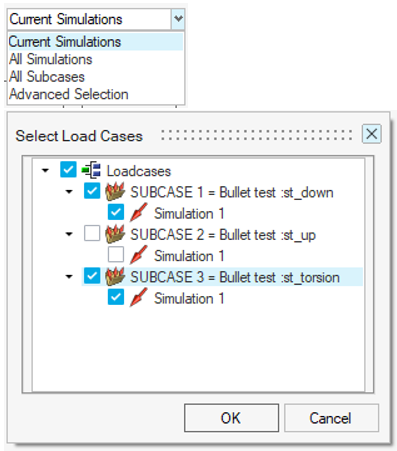 デフォルトでは、Current Loadcaseを使用します。All Simulations、All Subcases、またはAdvanced Selectionなどのオプションを選択することで変更できます。
