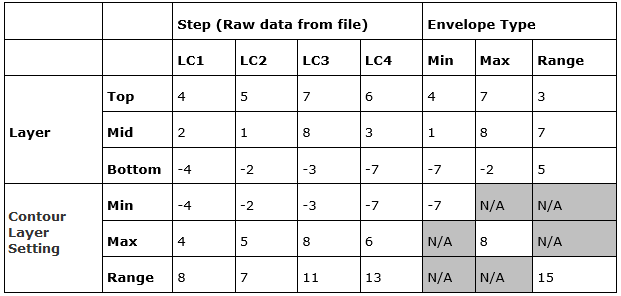 Contourパネルで特定の層が選択されると、その層についてすべての荷重ステップを巡回することでエンベロープ値が求められ、Min/Max/Rangeの値がレポートされます。層の集約がMin/Max/Extreme/Average/Rangeにセットされると、結果はEnvelope用に定義されたすべての荷重ステップを含む層すべてについて計算されます。