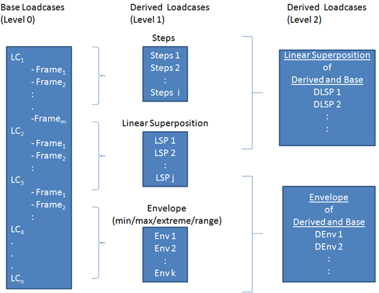 一部の使用例では、合成荷重ケースのエンベロープまたは線形重ね合わせを作成することが役に立つことがあります。線形組み合わせ荷重ケースのセットの最大値を求める、または異なるエンベロープタイプの荷重ケースの最大値を求めるような場合です。ソルバーによって提供されるベース荷重ケースから、ユーザーは2つのレベルの合成荷重ケースを作成することができます(下の画を参照):