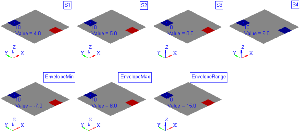 - 合成荷重ケース内で定義されている、選択された全ての荷重ステップまたはシミュレーション(適切なスケールファクターで重み付けされている)の中から最大と最小値の差を求めます。注: このオプションを選択すると、Contourパネル内のEnvelope trace plotオプションが使用不可となります。
