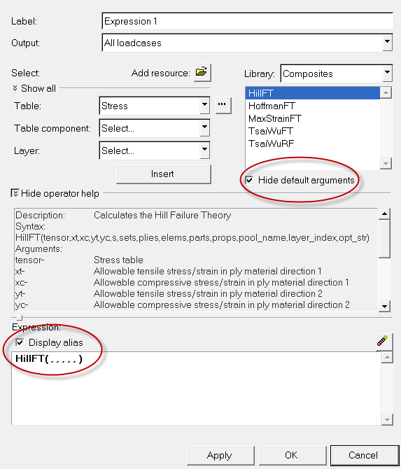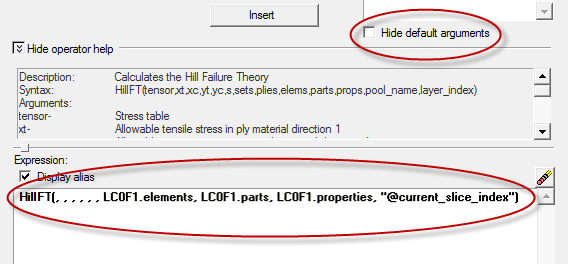 上記の例では、破壊理論演算子が挿入されていますが、Hide Default Argumentsにチェックマークが入っているため、デフォルト値のないパラメータのみが表示されています。このモードは、演算子が式テキストに挿入される方法に影響を与え、既存のテキストは変更されません。式には、デフォルト値が非表示になっている演算子に加え、デフォルト値が示されている演算子も使用できます。パラメータのカンマ区切りのリストを追加するだけで、挿入された演算子に引数を追加することができます。