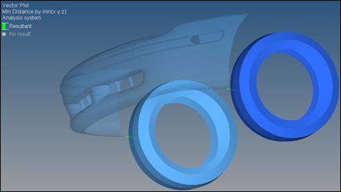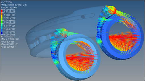 NSMinDisance演算子を用い、表示のオプションを"byall"に設定した際の、2つの節点セット(the tire)から1つの要素セット(the bumper fascia)への最小距離の計算: