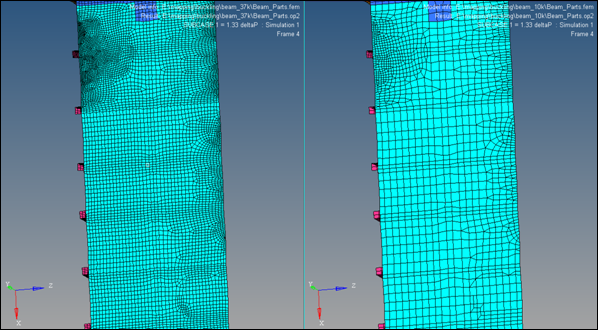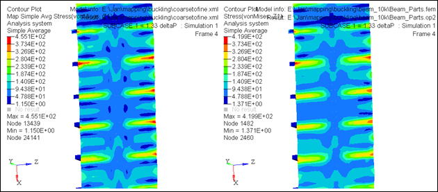 左側のモデルは細かいメッシュ(~37K要素)で、右側の粗いモデル(~10K要素)からマッピングされた値を表す: