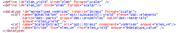 フォンミーゼス応力と材料降伏値を保存するために、要素境界スカラーの2つのテーブルが生成されます。これらのテーブルは、テーブルが評価される際に満たされ、1つのコールから次のコールへと渡されます。最終コールはBCMatToElemおよびScalarExtractによって満たされるテーブルを分割し、正規化されたフォンミーゼス応力を@datatype_valueに保管します。