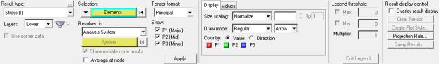 Tensorツールは、様々なソルバーについて、要素値から、応力とひずみの方向と大きさのテンソルプロットを表示するために使用します。