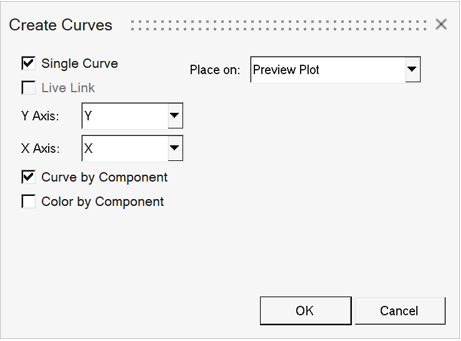 オプション 説明 Single Curve トレースリストボックスのすべての節点からカーブを1つ作成します。このチェックボックスを選択すると、X軸、コンポーネント単位カーブ、コンポーネントによる色分けオプションが有効になります。 Live Link Traceパネル選択とHyperGraphウィンドウのカーブとのリンクを確立させたい場合は、Live Linkチェックボックスを 選択します。このオプションを有効にすると、コンポーネント単位カーブとコンポーネントによる色分けオプションが無効になります。 Y Axis, X Axis (位置)メジャーの成分を選択し、プロット内のY軸とX軸を定義します。 注: トレースパネルからカーブをプロットするために、裏で位置メジャーが作成されます。Curve by Component すべての節点から1つのカーブを作成する場合、このチェックボックスを選択すると、コンポーネントごとに1つのカーブが作成されます。 Color by Component すべての節点から1つのカーブを作成する場合、このチェックボックスを選択すると、対応するカーブにコンポーネント表示色が割り当てられます。 Place on カーブ用の移動先ウィンドウを選択します。 -