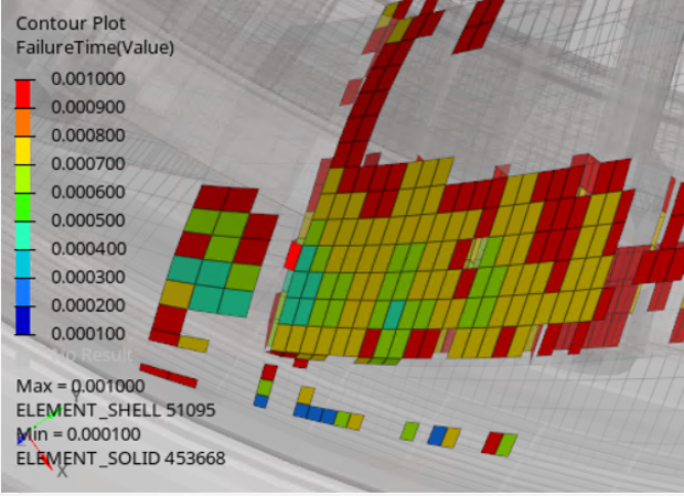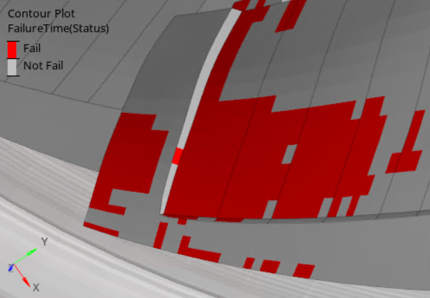 注: FailureTimeコンタープロットは、読み込み済みのステップに基づいています。例えば、1つのシミュレーションが50ステップからなり、最初の10ステップでは要素に問題はないと想定します。最初の10ステップのみが読み込まれ、FailureTimeがコンター表示された場合、プロットにはN/Aと表示されます。したがって、要素の正確な破壊情報を表示するためには、FailureTimeの読み込み前に、このシミュレーションのすべてのステップが読み込まれることが推奨されます。