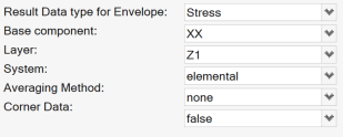 エンベロープの場合、データ成分メトリックに基づいて、完全なデータタイプが格納されます。つまり、Stress: von Mises, maxに基づいて荷重ケース間のエンベロープとして作成されたDLCは、各エンティティの最大フォンミーゼス値となる完全なテンソル状態を格納します。この場合、必要なデータタイプのみが格納され、その他のデータタイプは使用できません。図 4.