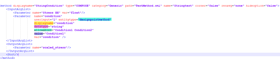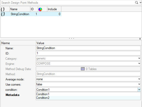 選択したコンフィグで指定されている通常のデータ名と共に、動的データ名がdesignpointmethod(またはstructuralproperty)に追加されます。これらはもはやメタデータではありません。次の例では、文字列条件(conditionと呼ばれる)がdesignpointmethodに追加されています。これは次の2つの値を受け入れます: