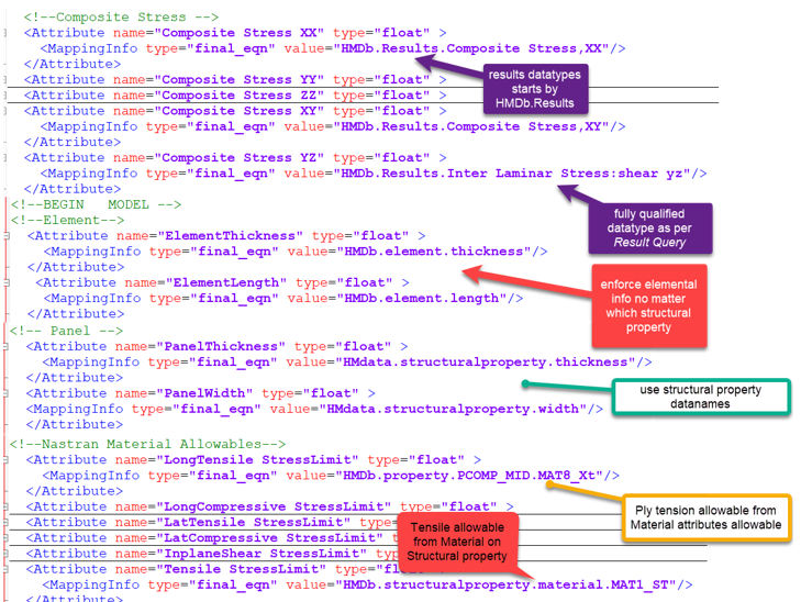 designpointが複数の要素で構成されている場合は常に、このフレームワークによってdesignpointの内容がループ処理されます。例えば、panel_composite designpointで使用される“Composite Stress XX”は、要素ごと、およびレイヤーごとにSxxを照会します。属性は、完全修飾パスを使用して柔軟に定義できます。デフォルトでは、プロパティや材料に基づいた属性は、structuralpropertyのプロパティエンティティから照会されます。使用可能なプロパティエンティティがない場合、クエリは要素のプロパティレベルで実行されます。
