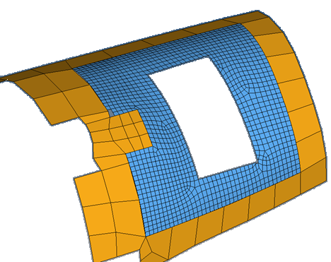 これにより、RBE3結合を使用して2Dシェルメッシュ同士が結合されます。注: 高さは、GFEMモデルとDFEMモデルでのコードの高さの差です。この高さがユーザーが指定した高さトレランスを上回っている場合、RBE3は作成されません。グローバル有限要素モデルは、内部荷重計算用のシェル要素とビーム要素からなる粗いFEモデルです。詳細有限要素モデルはきめ細かいモデルであり、たいていは、詳細な強度計算のための細かいメッシュを使用したシェルとソリッドで構成されています。