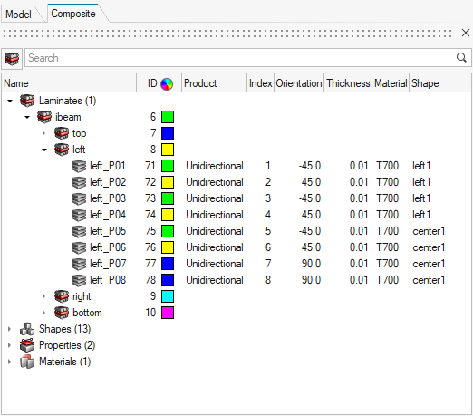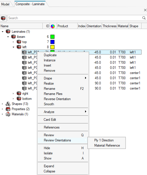 Compositeブラウザは、プライベースモデルで使用されるエンティティとツールを統合しています。プライベースのモデルは、Compositeブラウザ内で作成、編集、レビューが可能です。また、ABD matrix calculationなどのComposite stress toolbox機能は、関連するエンティティのコンテキストメニューで提供されます。