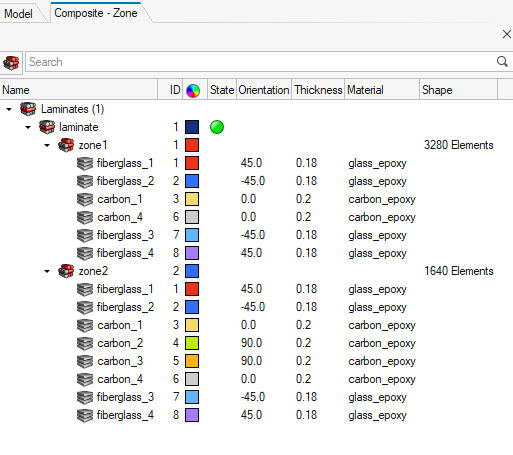 Zoneビューには、要素セットによって定義された形状を持つプライのみを含む積層材内の一定の厚みのゾーンがすべて表示されます。ゾーンには、積層材を構成しているプライのサブセットが含まれます。プライの一意の各サブセットに、1つのゾーンが計算されます。ラミネートのコンテキストメニューからSync Zonesを選択すると、ゾーンが計算されます。同期していないゾーンと完全に同期されたゾーンがある積層は、それぞれ青いアイコンと緑のアイコンでState欄に表示されます。現在の機能は次のとおりです:
