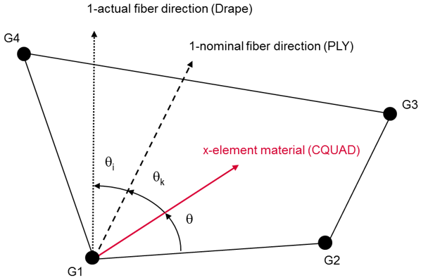 基準方向によって、各プライの0度の1方向が指定されます。基準方向は、要素またはプロパティによって設定され、デフォルトのソルバー要素座標系のx方向から回転したものです。HyperMeshは、各ユーザープロファイルの材料方向の一般的な方法をサポートしています。固有の定義はユーザープロファイルによって異なります。例えば、OptiStruct次のようになっています。図 1.