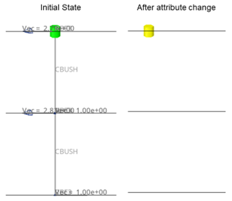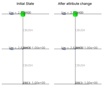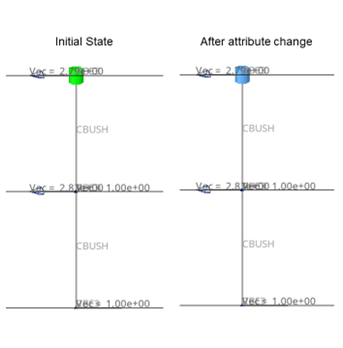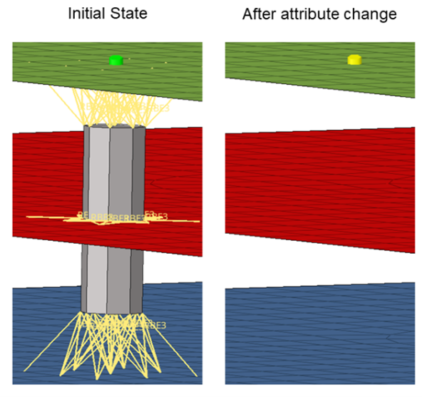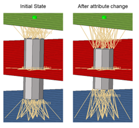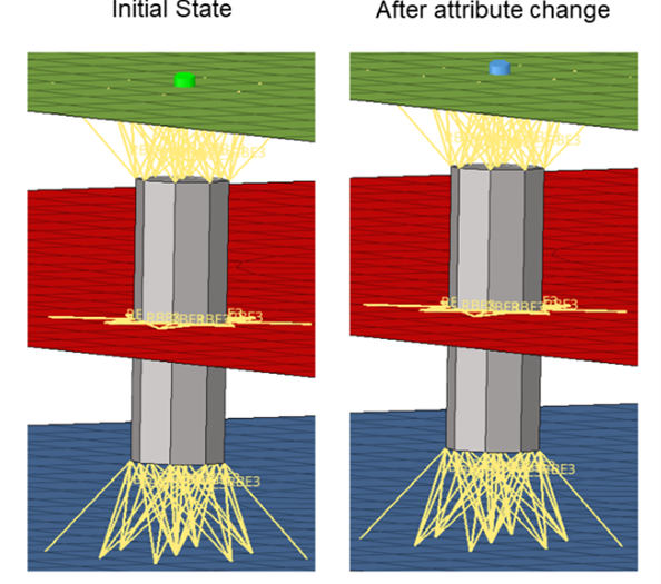 Huth計算法を使用したスプリング(剛体)ポイントコネクター(rbe3-cbush-rbe3)。パートの材料レイアップを変更します。この材料変更によって剛性プロパティは無効になります。その後コネクターの状態は自動的にmodifiedに変更され、リアライゼーションに対して更新を実行できるようになります。これによりプロパティが再計算されますが、リアライゼーションは変更されず、番号付けも変更されません。この例では、Calculation ChangesのプリファレンスはModifiedに設定されていました。