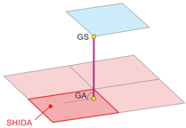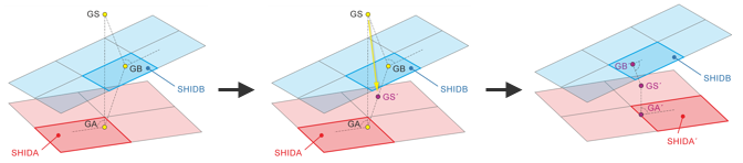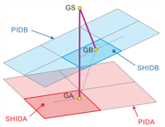recenter GS 当初のGS位置は、節点GAと節点GBの間に再配置されます。再配置後、2度目の投影が実行され、正しい節点 / 要素IDが特定されます。