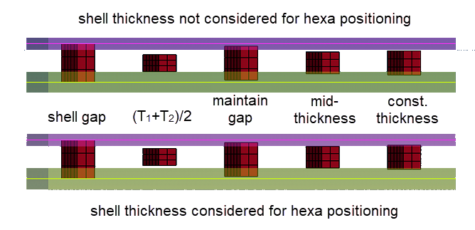 • ヘキサ要素の正確な位置は、consider shell thickness and offset for solid positioningオプションによっても変化します。